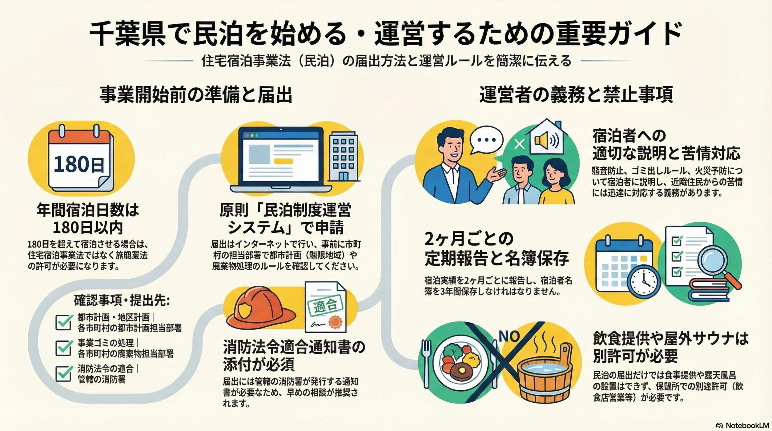 しかし、民泊を始めるには住宅宿泊事業法に基づく適切な届出が必要です。鎌ケ谷市は千葉県の管轄となるため、千葉県の定めるルールに従って手続きを進める必要があります。